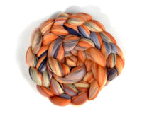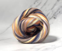 Inspired by the glowing hues of a California sunset. Soft peach, golden amber, creamy ivory, lavender, and deep indigo swirl together in this luxurious fibre, perfect for spinning, felting, or blending.