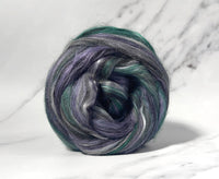 A magical mix of bamboo, corriedale, and sparkling stellina. Deep greens, rich purples with a strike of mythical sparkle. Perfect for spinning & felting.